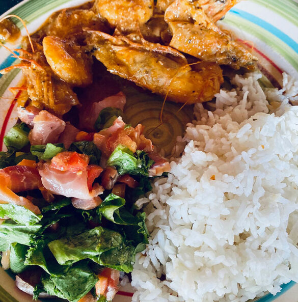 For dinner, fish of the day with Creole sauce, chicken, breadfruit/rice and a variety of salads and curries depending on local offerings.